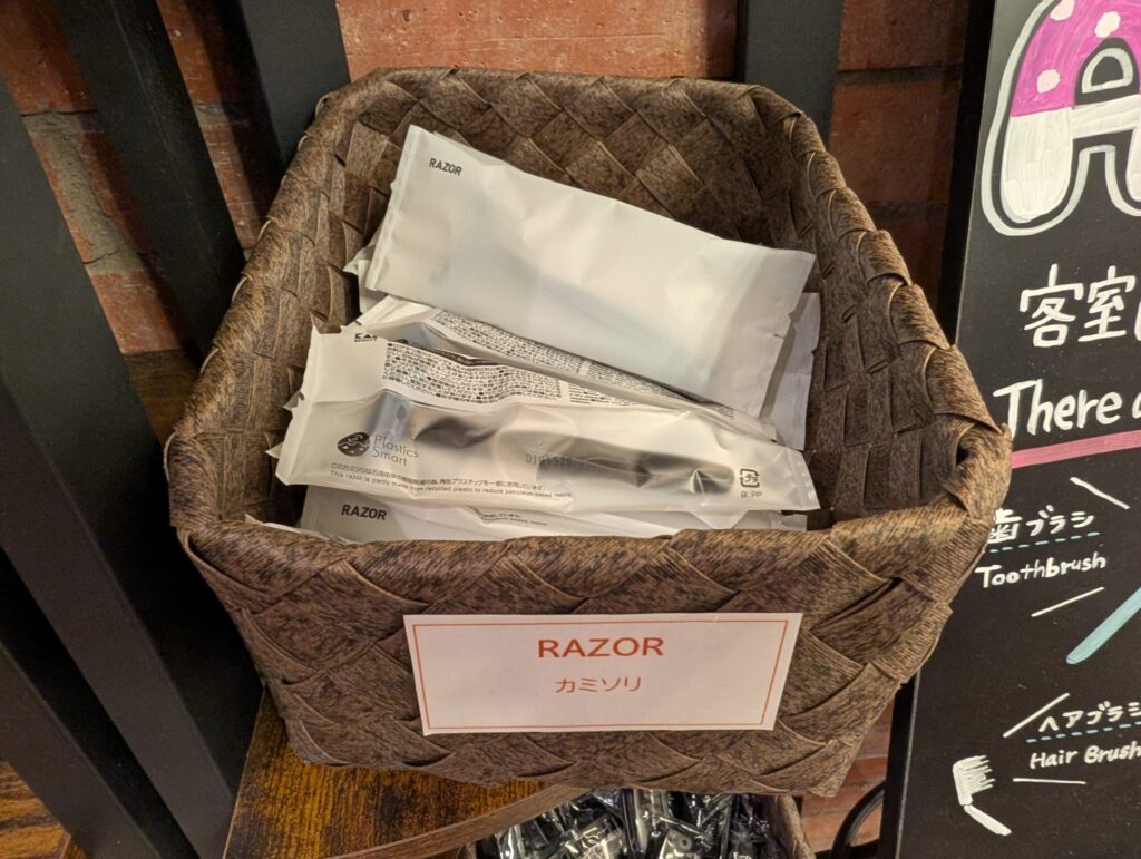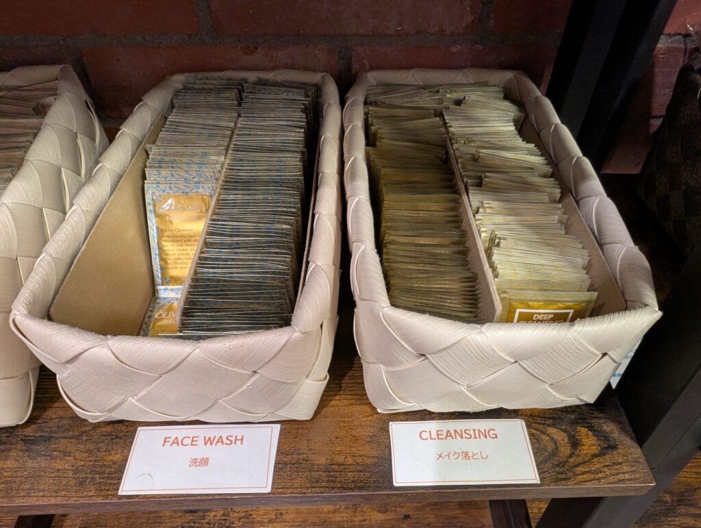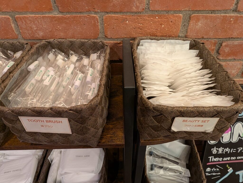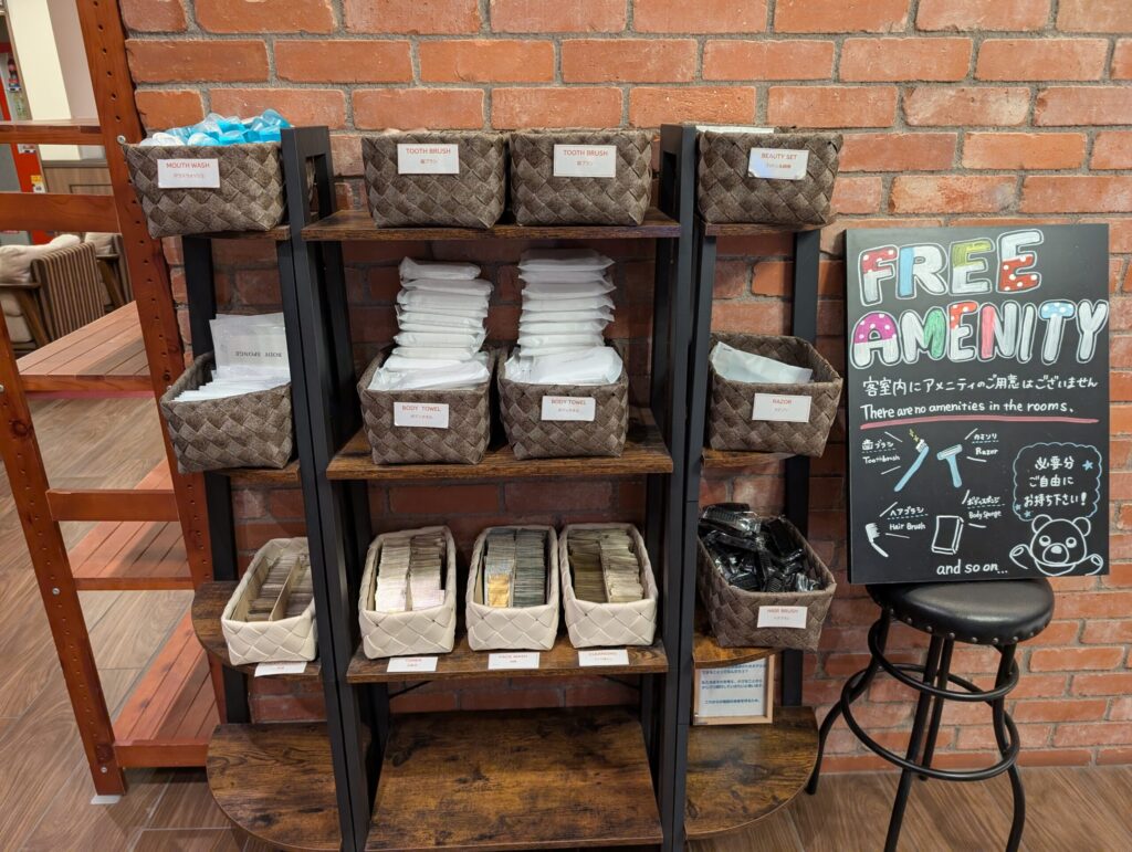 お部屋にはアメニティがほとんど置かれていないので、必要なものはこちらからピックアップするシステムです。