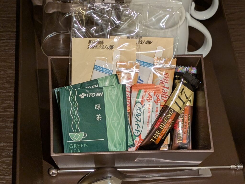 温かいドリンクはコーヒーマシンと、辻利の煎茶や各種紅茶のティーバッグが提供されていました。