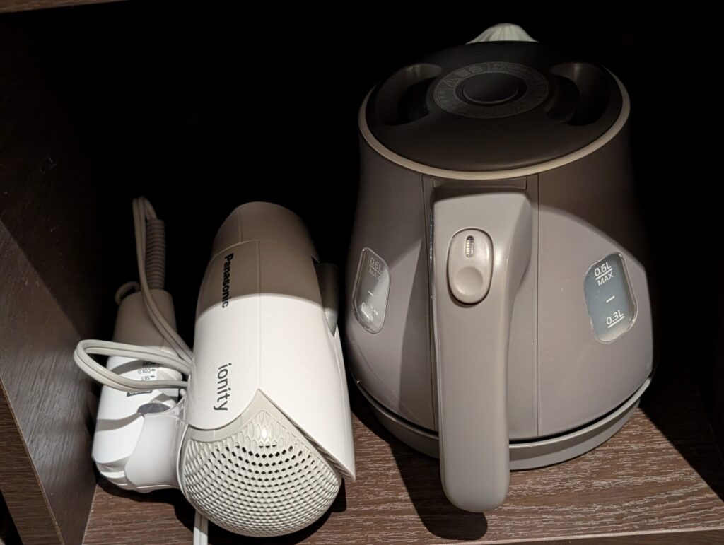 ティーコーナーには緑茶のティーバッグ、インスタントのコーヒーなどがあり、ケトルとドライヤーもこちらにありました。