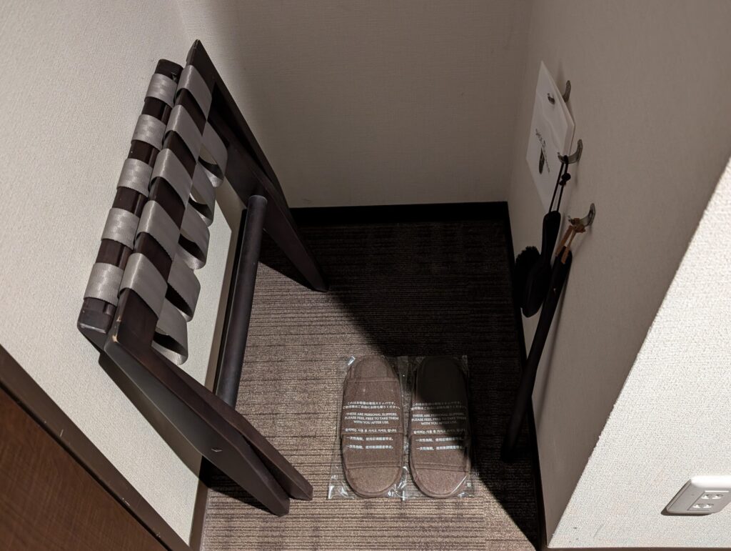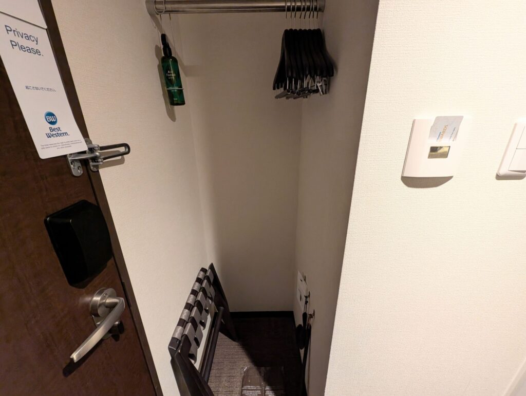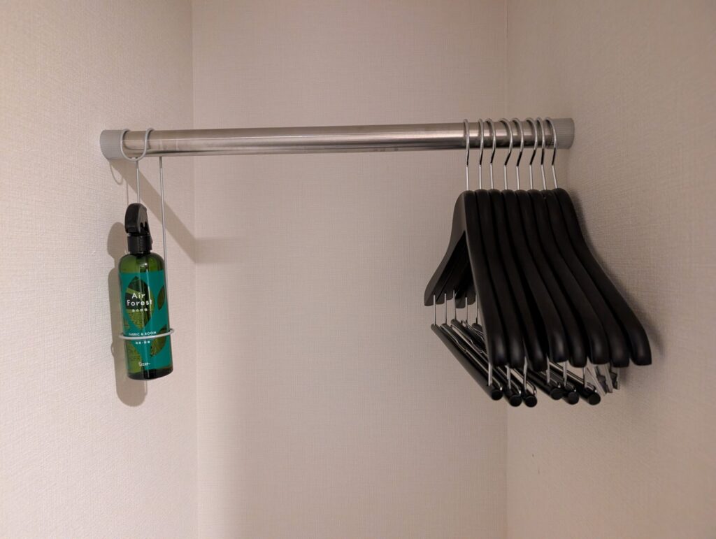 クローゼットは入り口近くにあり、衣類用スプレーやラゲッジラック、スリッパなどがありました。
