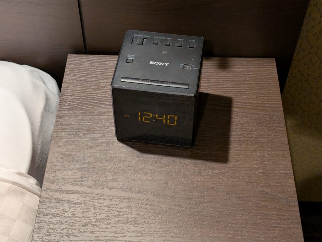 枕元にはBluetoothのスピーカー…ではなく、ラジオ付きめざまし時計がありました。
