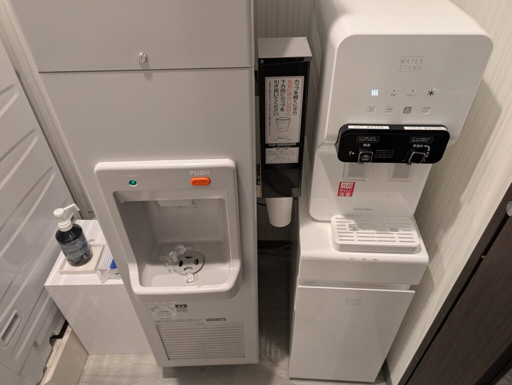 飲料水のボトルは提供されていないものの、ウォーターサーバーがあるのはありがたいですね。