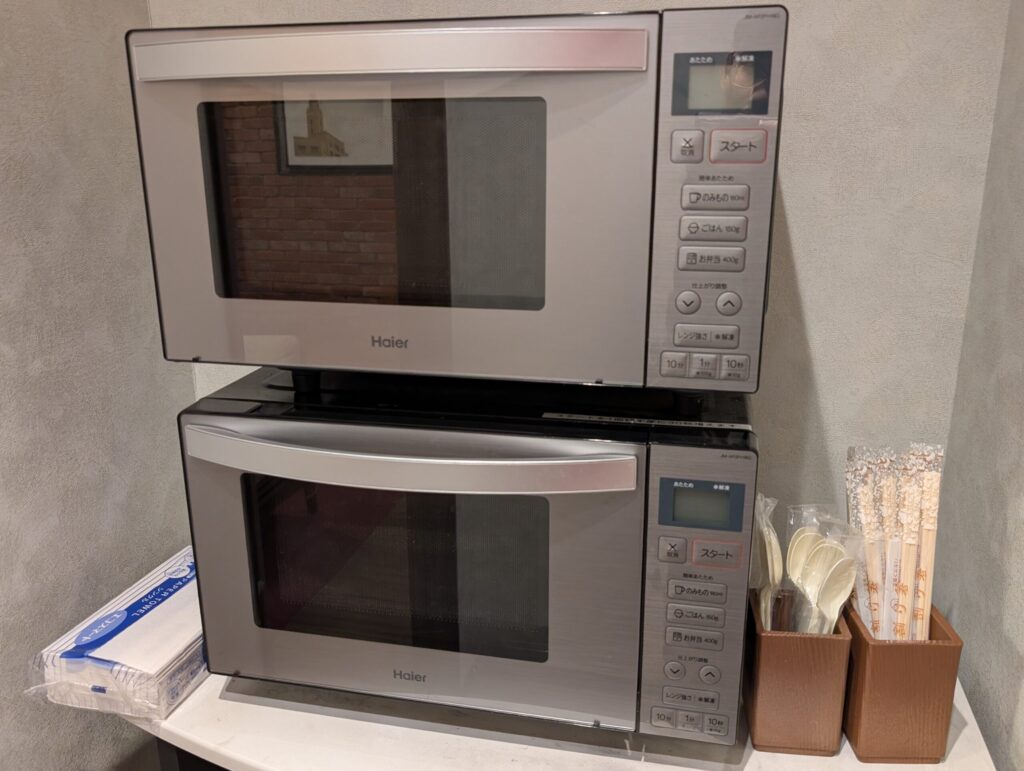 電子レンジは2台あり、プラスプーンや割りばしも備え付けられていました。