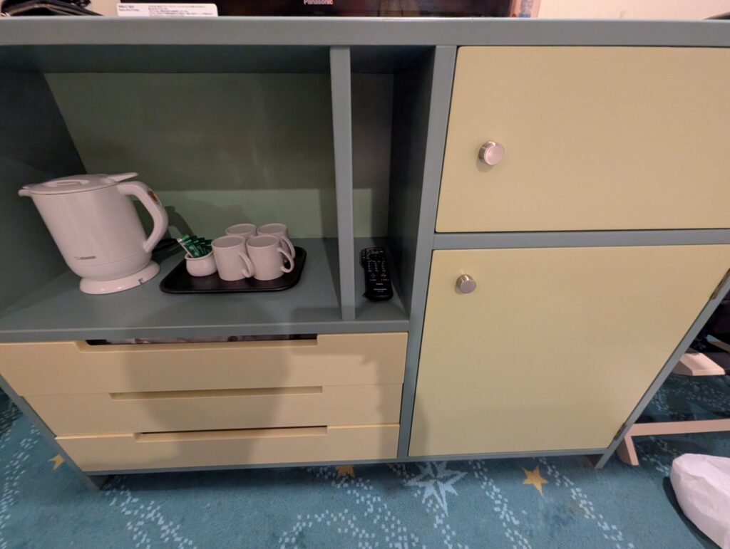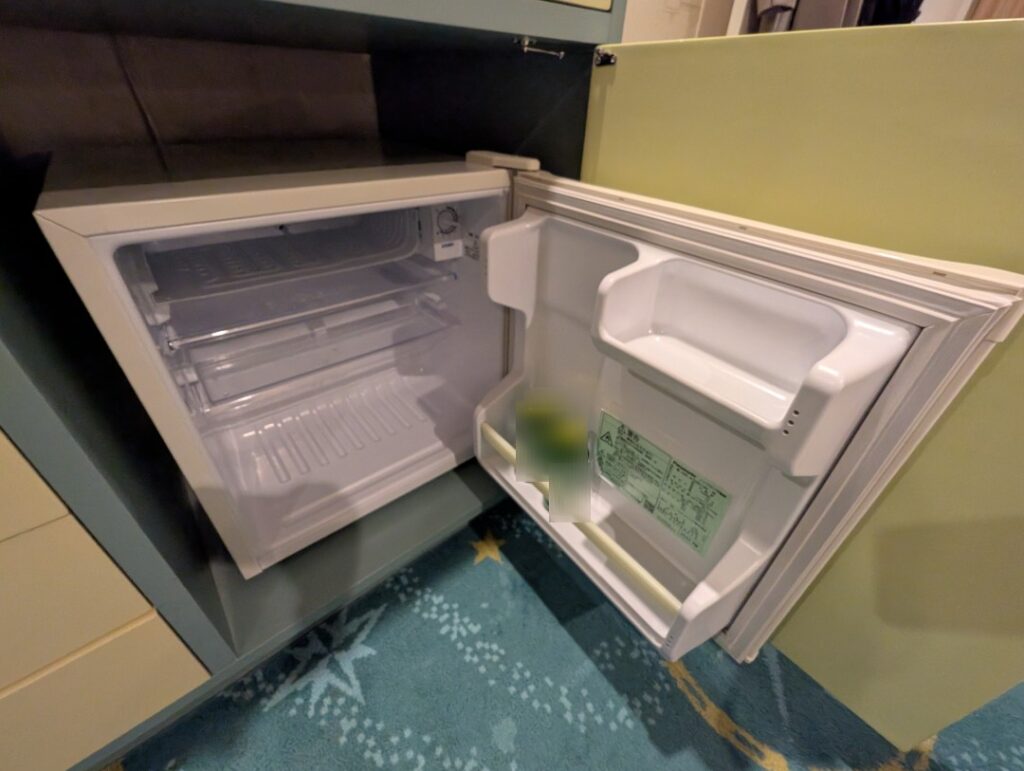 テレビ台の下にはコーヒーや紅茶などのセットや冷蔵庫がありました。