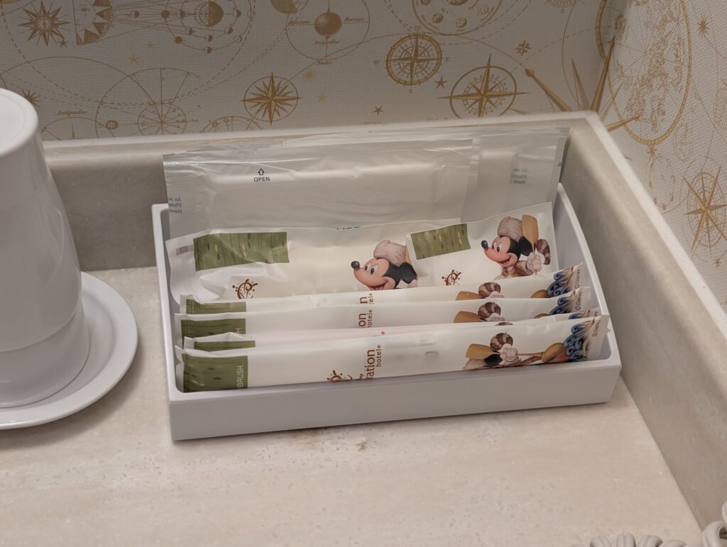 ディズニーホテルということで、洗面台にはミッキーやミニーが描かれたパッケージのアメニティが用意されています。