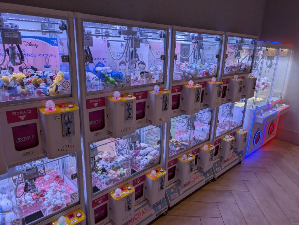 ラウンジ、喫煙室の案内表示からお部屋までの通路にはUFOキャッチャーが複数台設置されています。