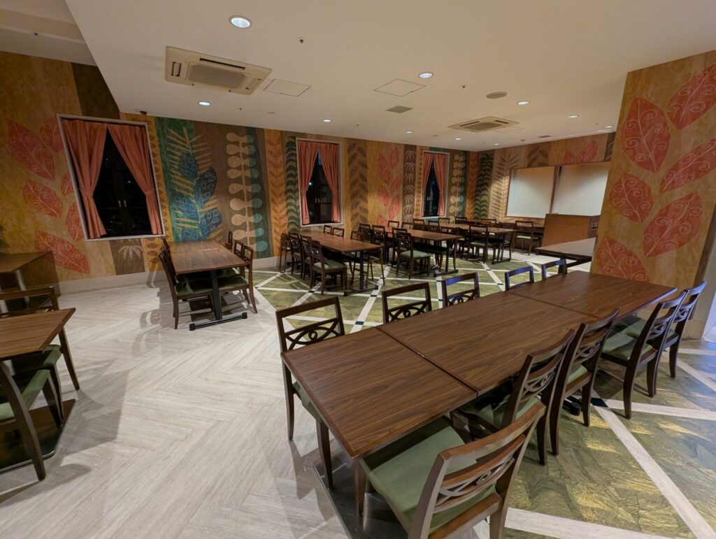 ラウンジは何かが提供されていたりするわけではありませんが、落ち着いた内装の広い部屋にたくさんのテーブルと椅子が並んでおり、部屋をまたいで集まって話をしたい時などに便利な空間でした。