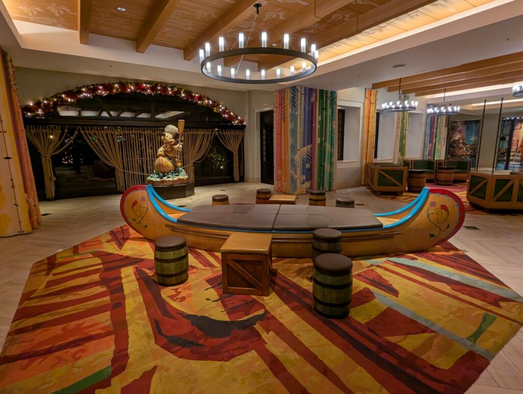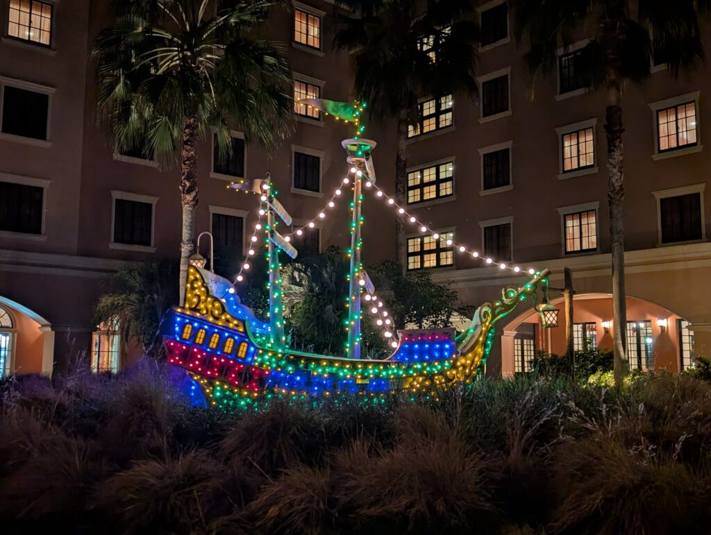 ディスカバーでは帆船や宝箱があった中庭ですが、ウィッシュにはエレクトリカルパレードのフロートのようにキラキラとしたキャラクターたちが待ち構えていました。
