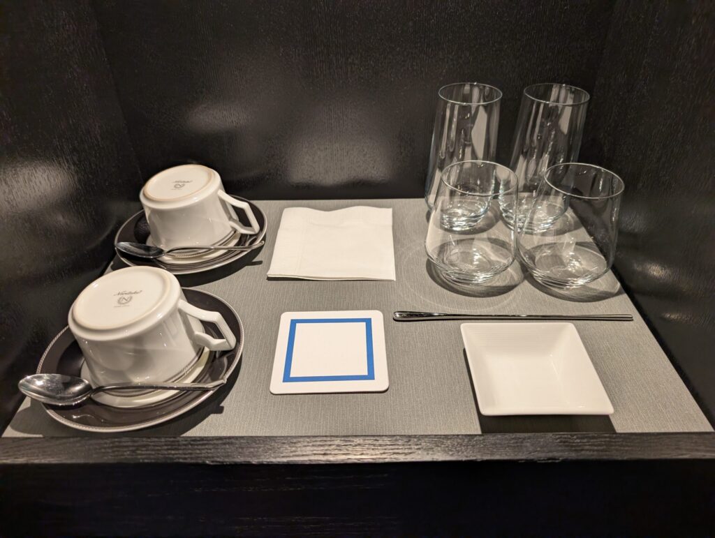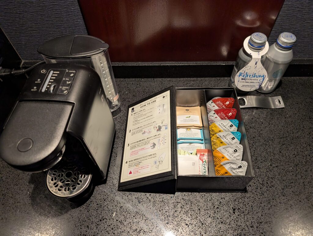 カフェコーナーはシックな雰囲気でまとめられており、UCCのコーヒーマシンと無料でいただける飲料水のボトルが用意されていました。