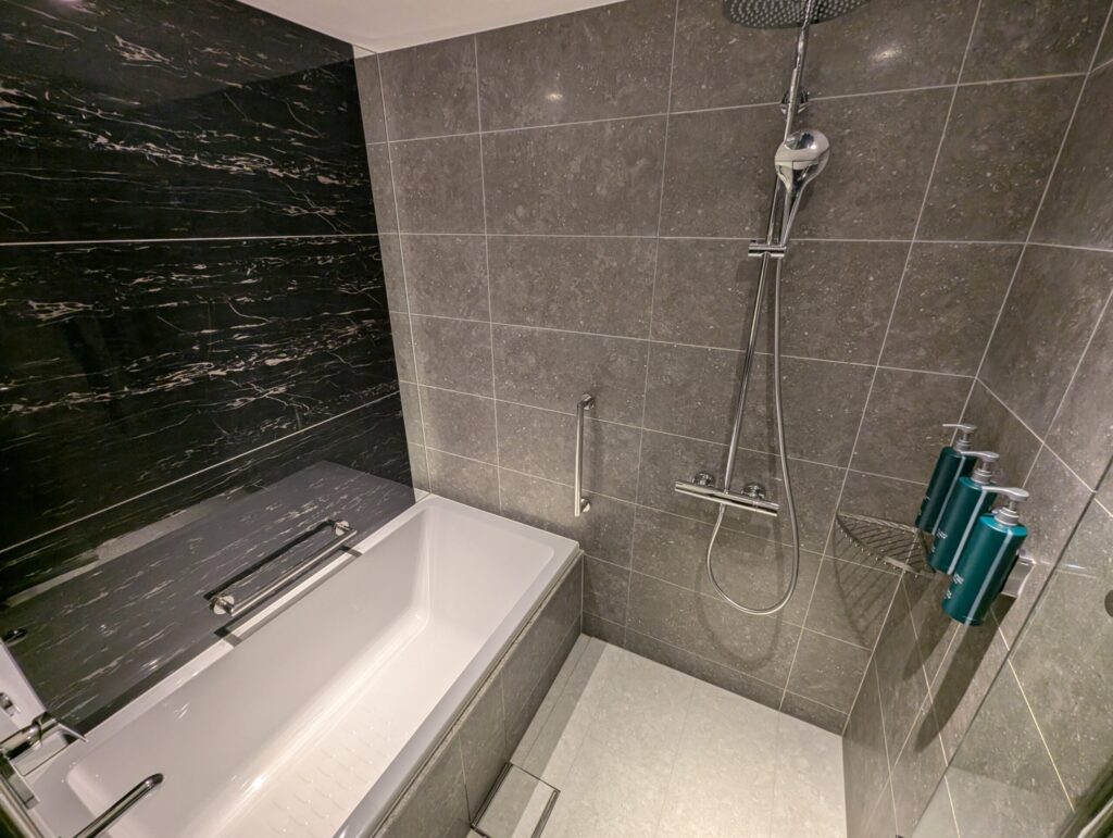 ゆったりと足を伸ばせる浴槽と、勢いは穏やかながらしっかりと洗い流せる、使い心地のよいシャワーヘッドが印象的でした。