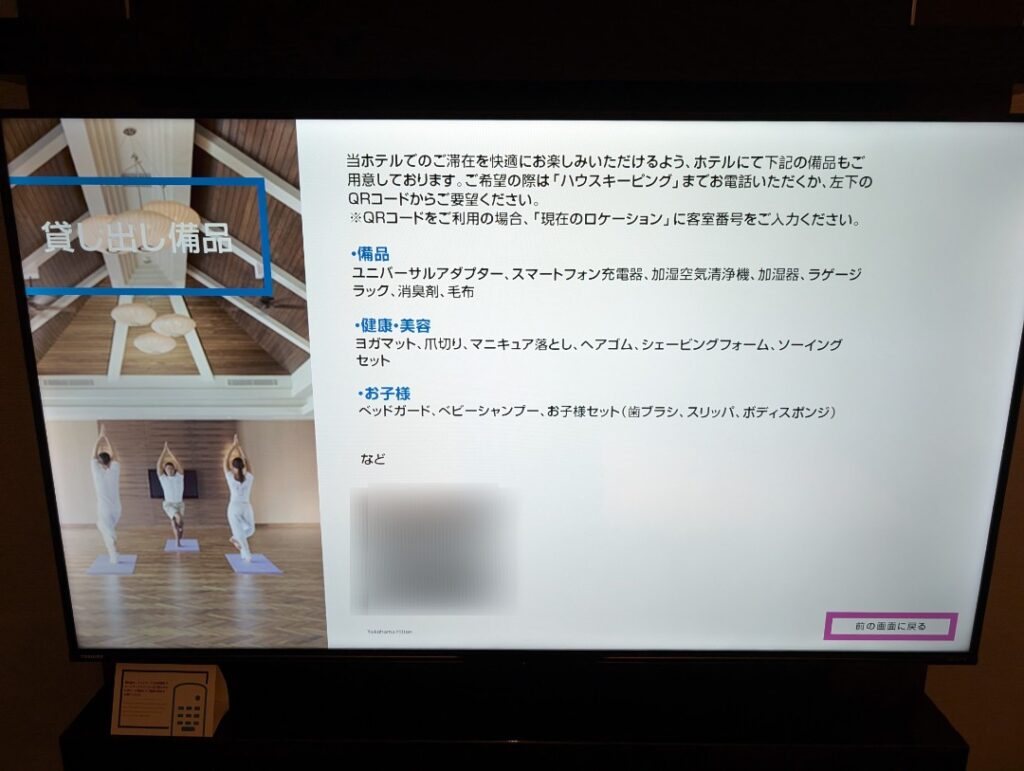 追加の貸出備品や飲料水等の追加依頼は、テレビに表示されるQRコードからオンラインで行えます。