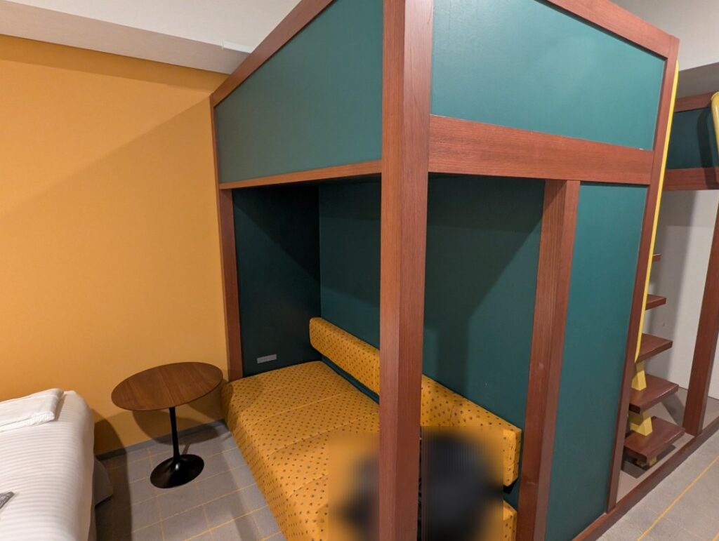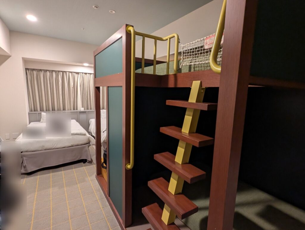 ご覧の通り、ホテルでは珍しい二段ベッドがあるのが特徴のお部屋です。