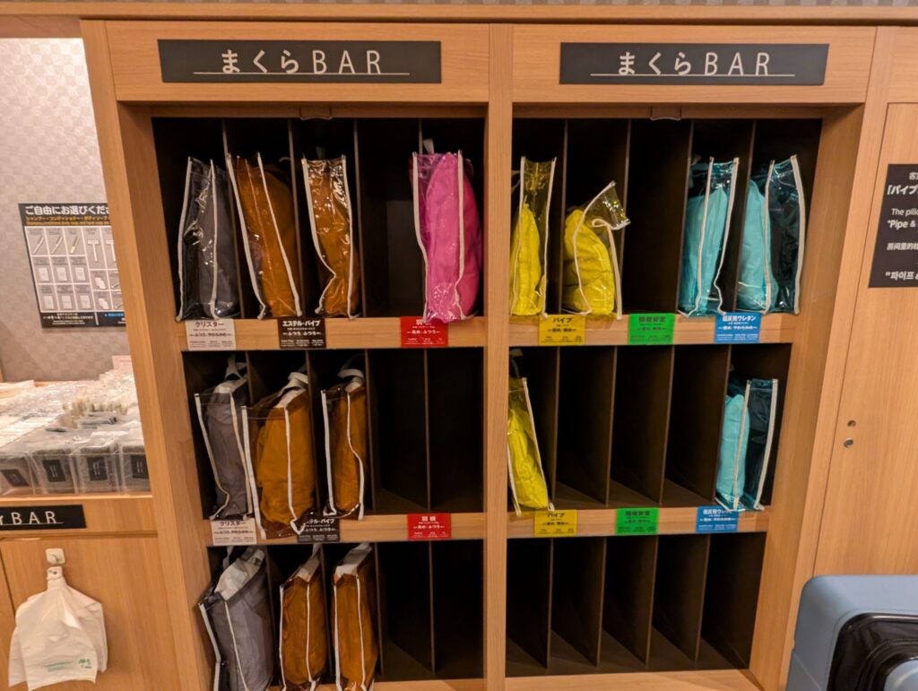 客室にももちろん枕はあるのですが、高さや硬さの様々な枕から、好みの枕を選んで使用することができます。