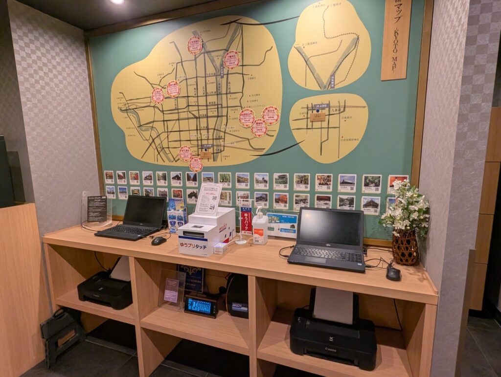驚いたのがこちら、郵便を送るのに便利なゆうプリ タッチの機械まで用意されていて、何かとサービスの行き届いたホテルだな、と思いました。(京都は今どこもそうなっているんでしょうか…?)