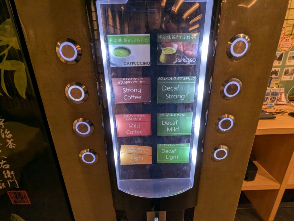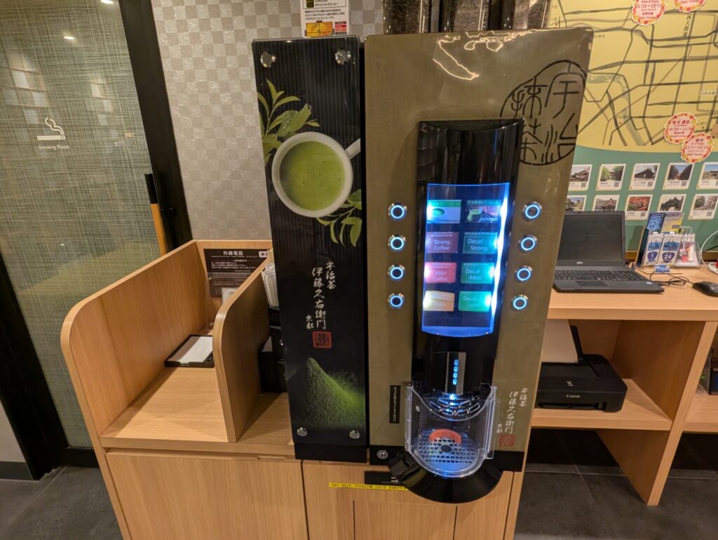 滞在中自由に利用可能な宇治茶「伊藤久右衛門」を使用した抹茶エスプレッソや抹茶カプチーノ、ホテルオリジナルブレンドコーヒーをいただけるドリンクマシンが設置されています。
