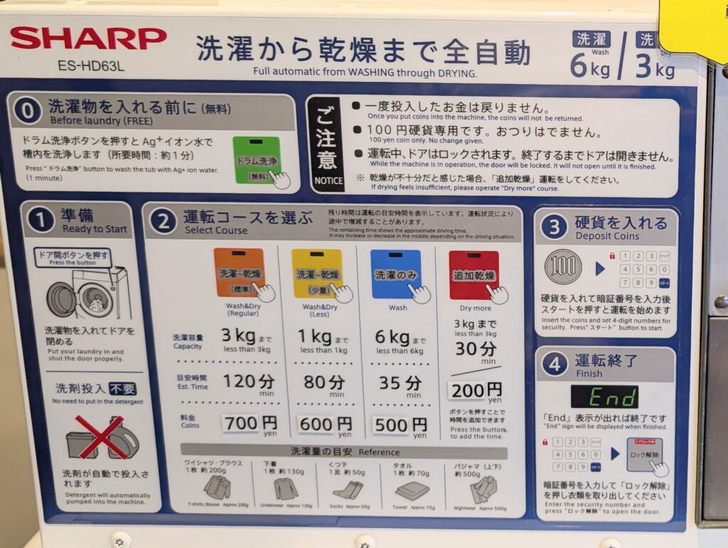 コインランドリーの料金については下の写真をご参考ください。