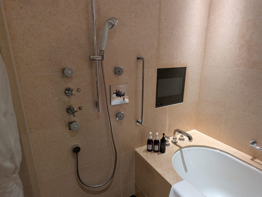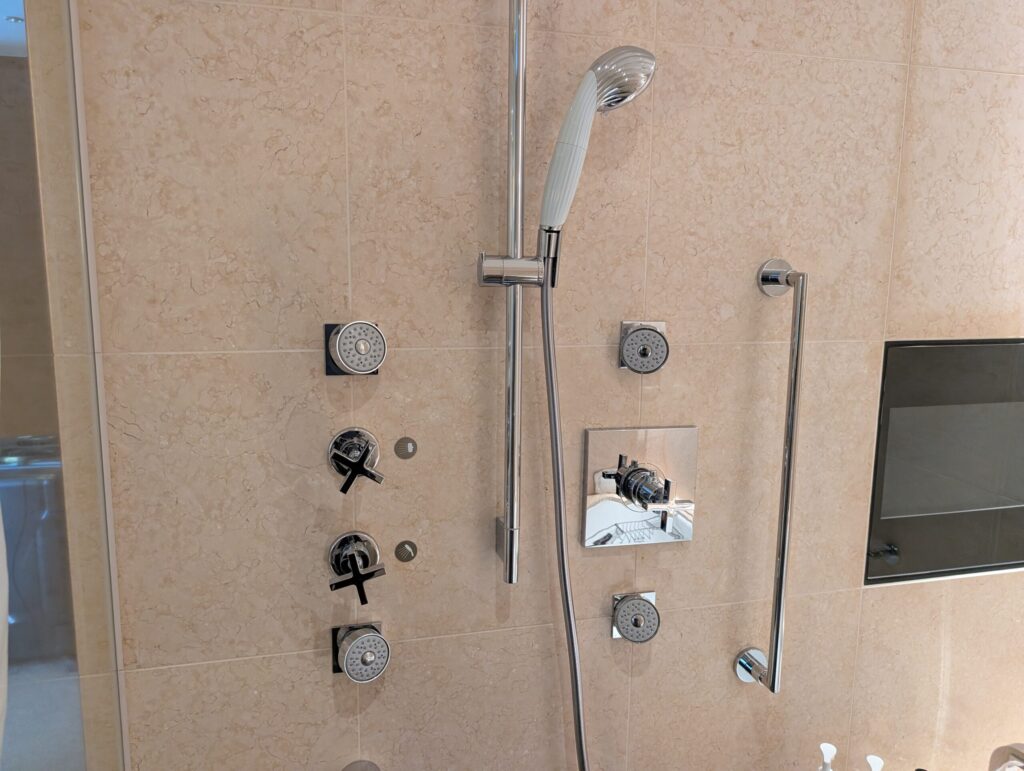 壁には通常のシャワーとボディシャワーがあり、シャワーヘッドはReFaのものでした。