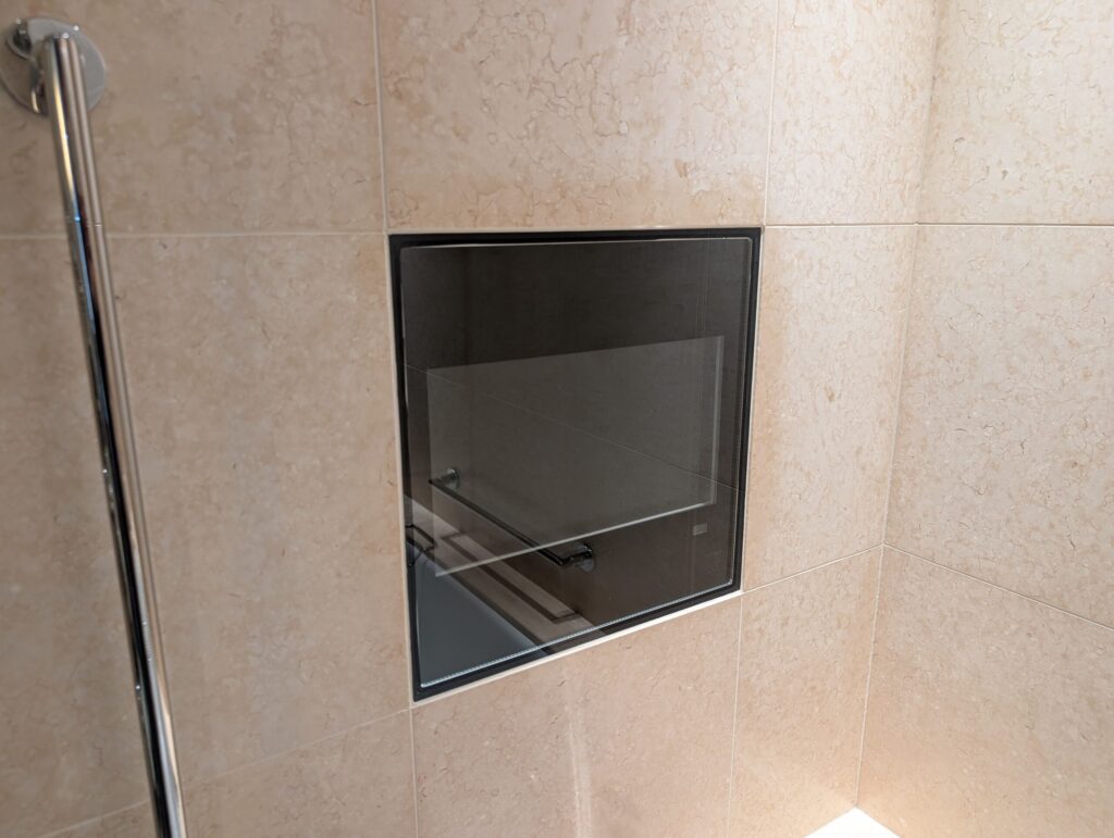 さらに、壁にはテレビモニターも埋め込まれており、湯船に浸かって寛ぎながらテレビを楽しむことができます。