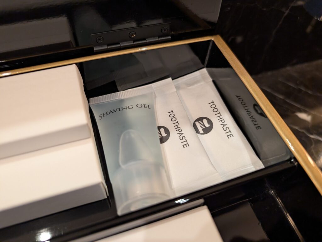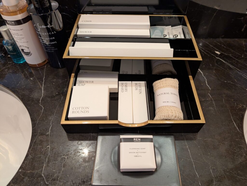 ソープディッシュには「REN」の固形石鹸が、ケースには各種アメニティが入っていました。