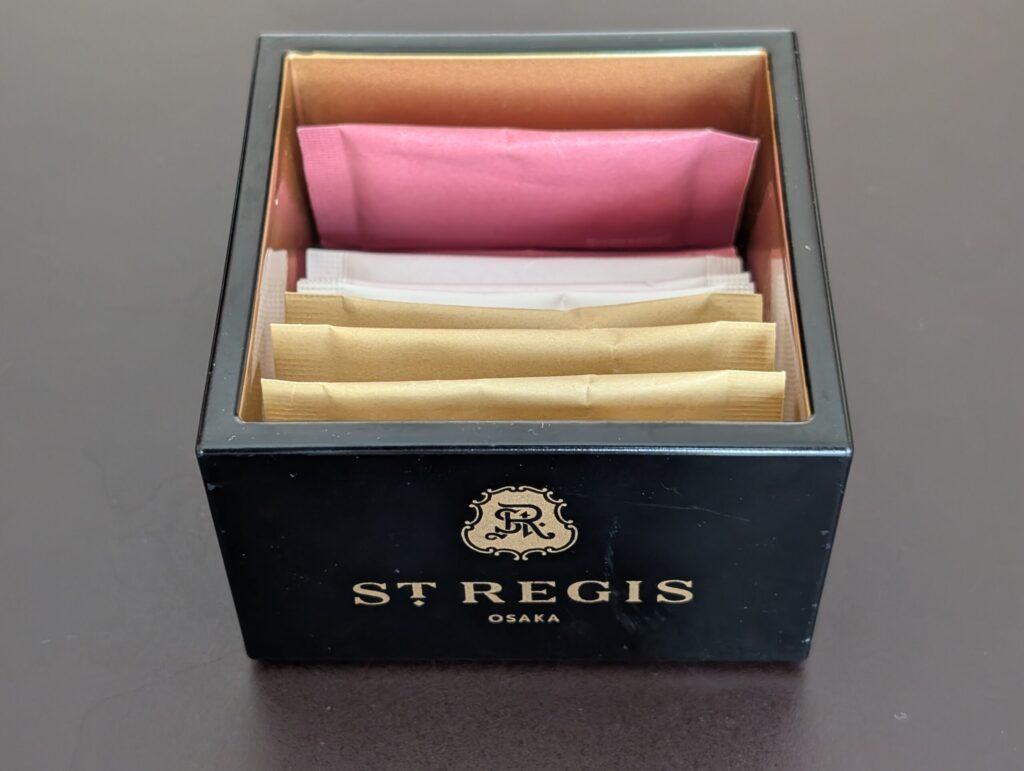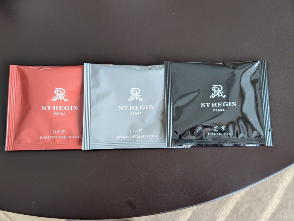 ティーバッグのパッケージにはセントレジス大阪のロゴが入っており、ほうじ茶、紅茶、煎茶の3種類あります。