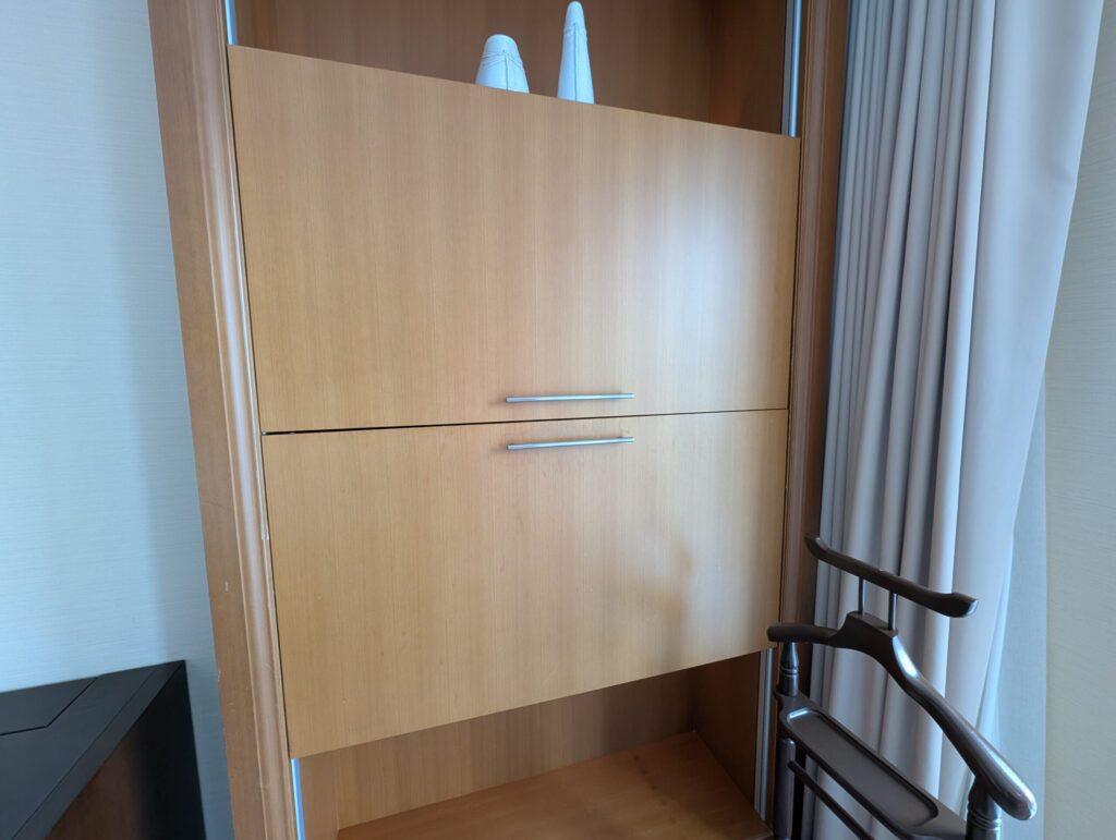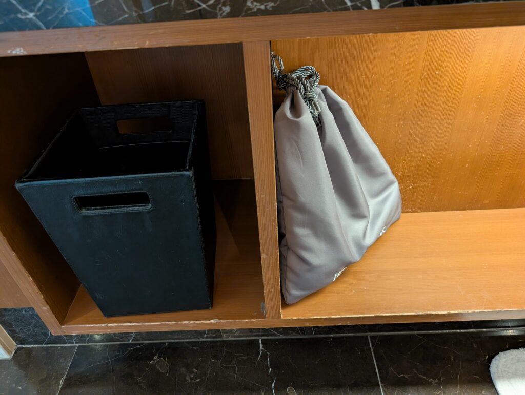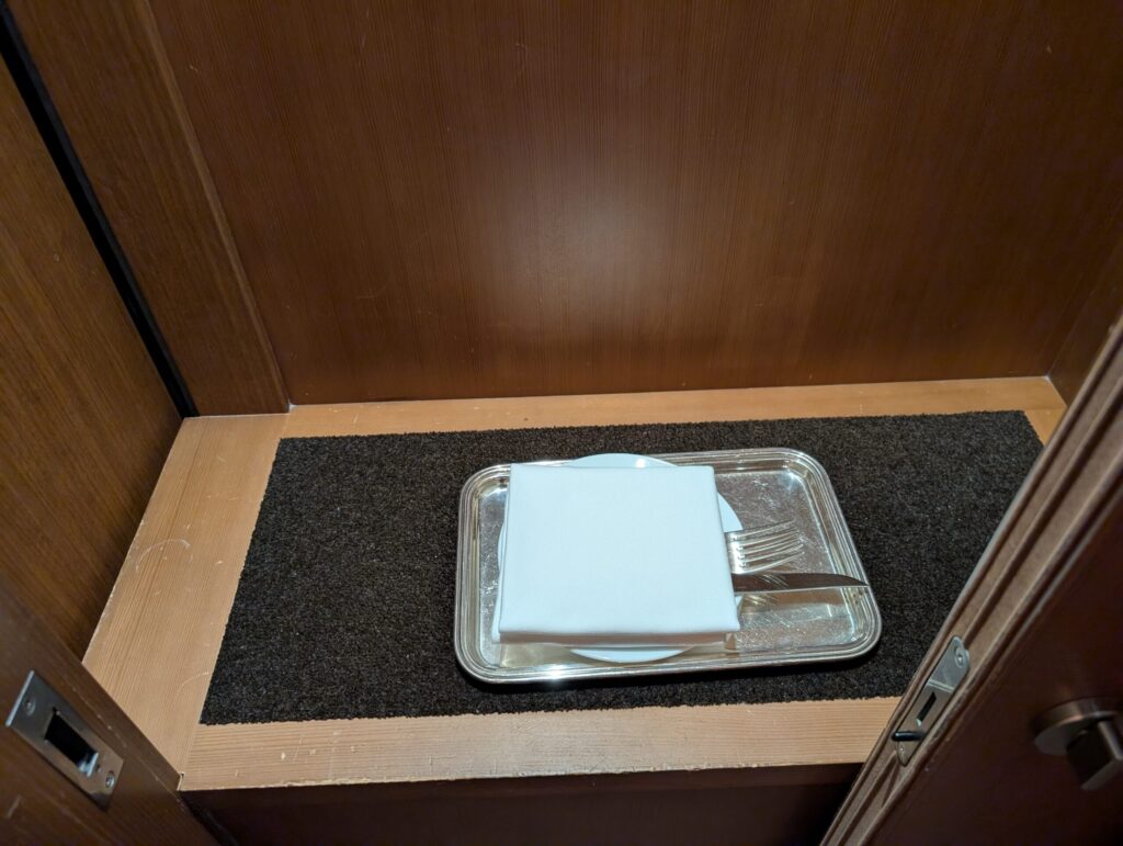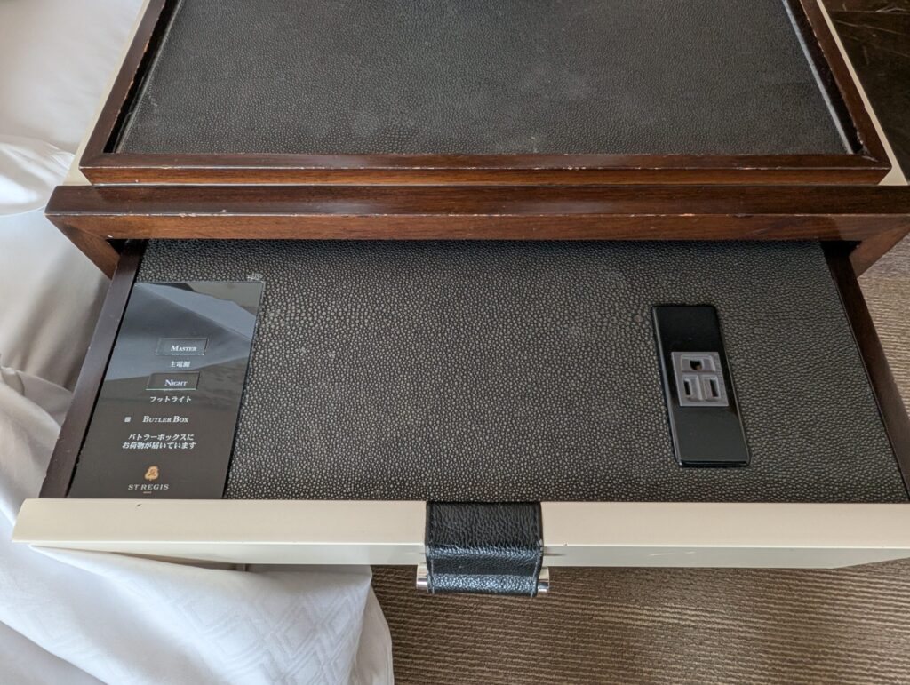 バトラーに依頼してお部屋に持ってきていただいたとき、直接対応せずともこちらのボックスに入れておいていただけるようになっており、何かと便利です。