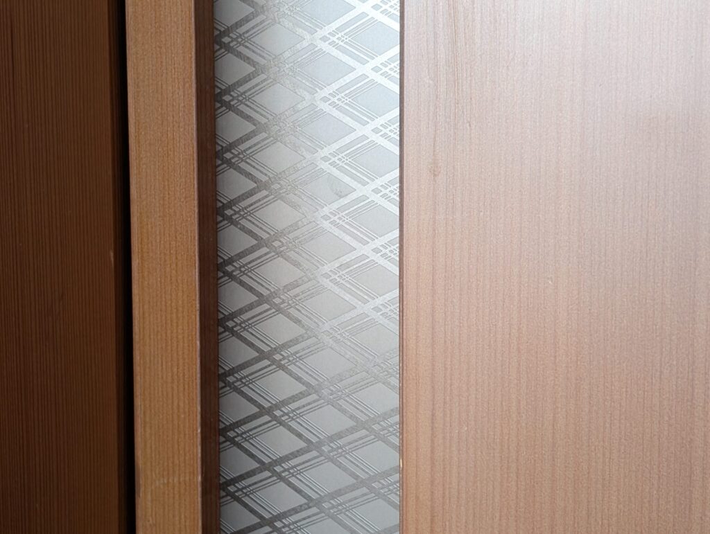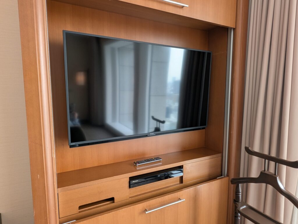 テレビは窓側側面の壁にあり、スライド扉式のテレビボードで隠れていました。