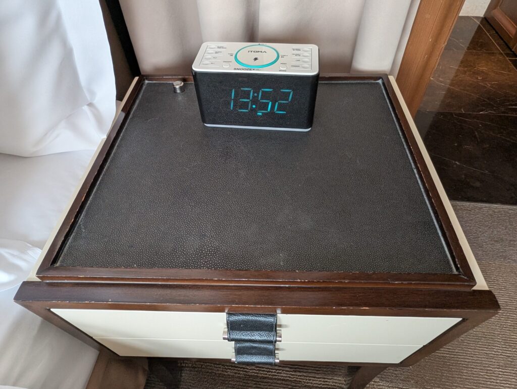 まずはベッドサイドです。片方には電話とメモ帳、もう片方にはBluetooth付きの時計がありました。