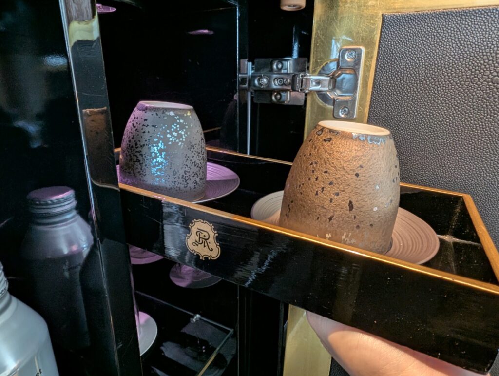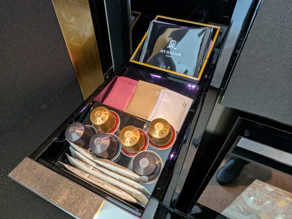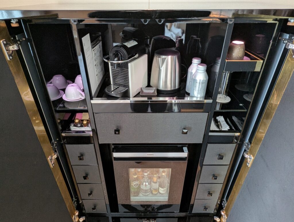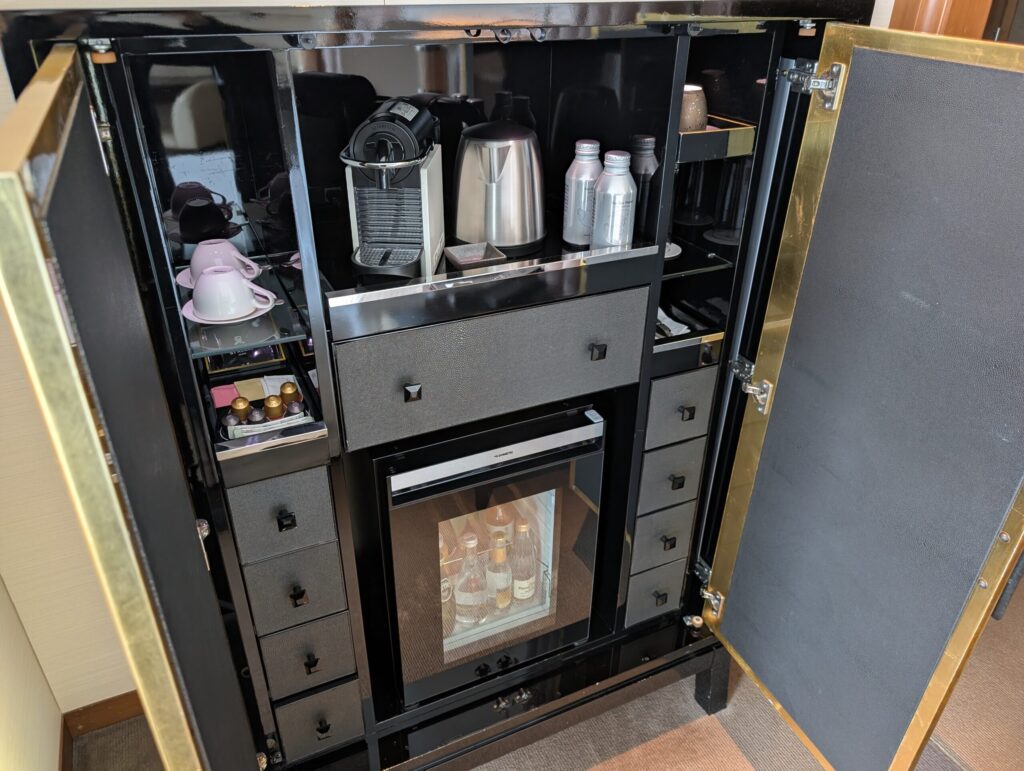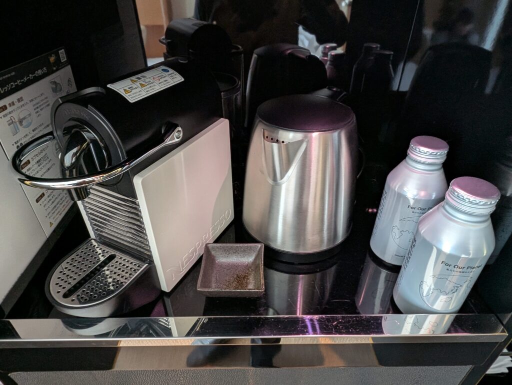 こちらはティーセットやミニバーになっており、ネスプレッソマシンやケトルがありました。