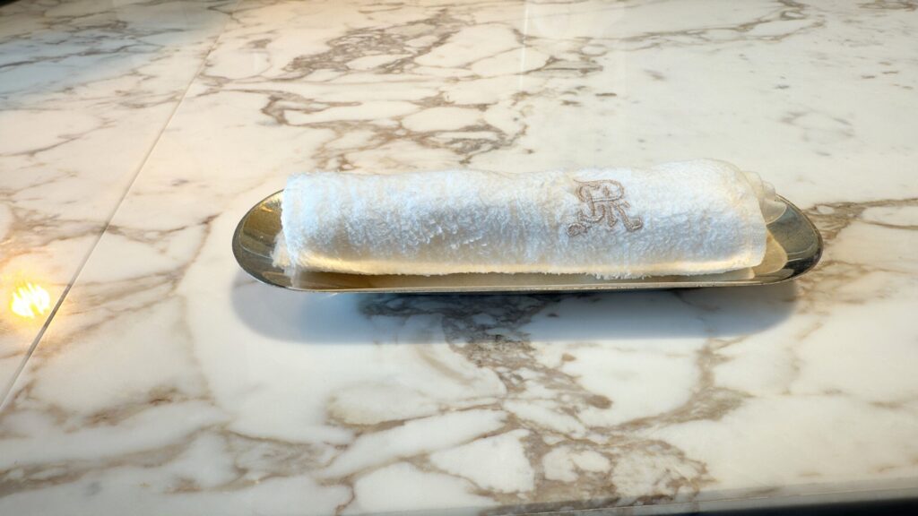 椅子に腰掛けるとセントレジスのロゴの入ったホカホカのおしぼりを出していただいて、チェックインの手続きをします。