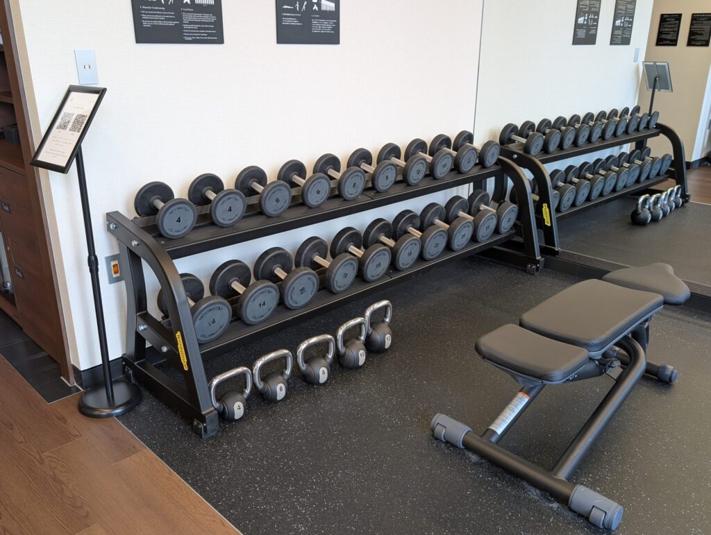 ベンチやダンベルなどのフリーウェイトのスペースもあり、筋トレをしたい方も満足できそうな設備です。