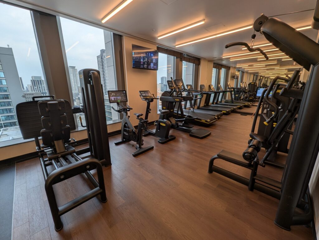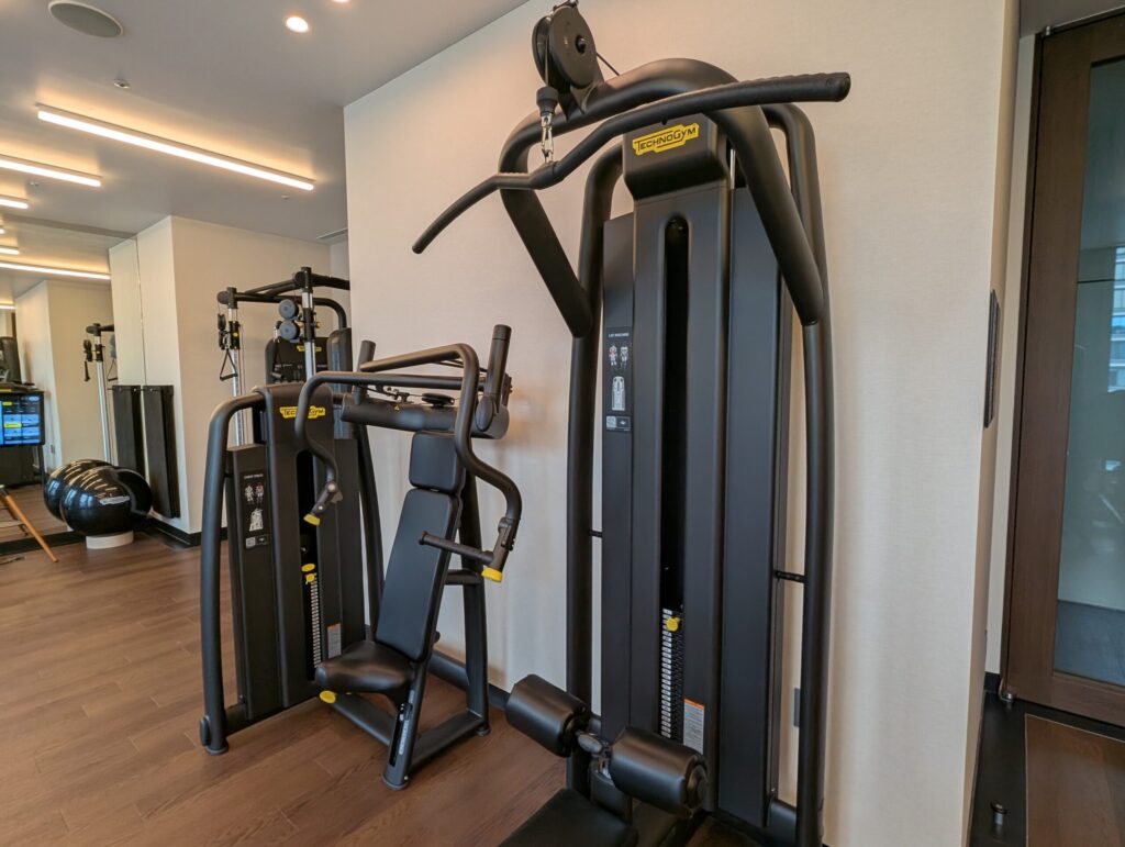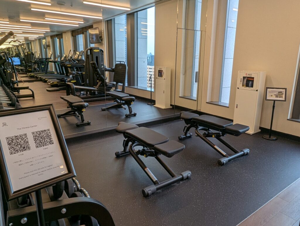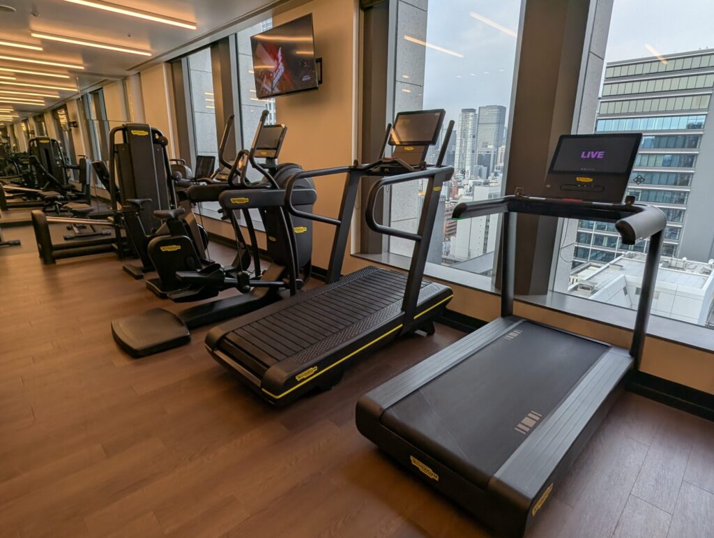 大阪の街並みを眺めながら身体を動かせるトレッドミルなどの有酸素マシンを中心に、筋トレ用のマシンも取り揃えられています。