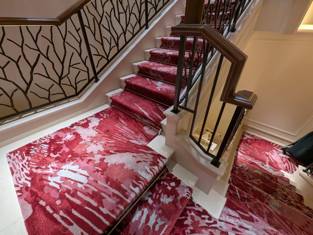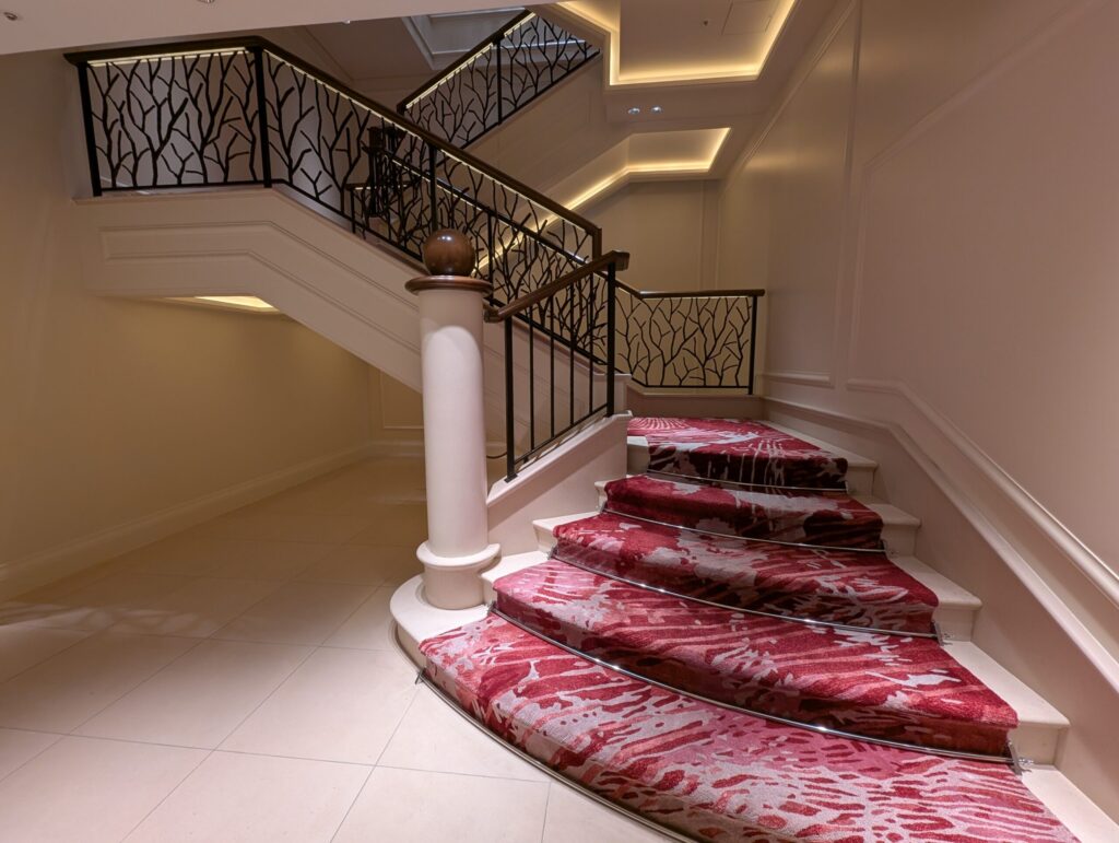 白を基調としたインテリアや内装に、深みのある赤い絨毯に目を引かれました。