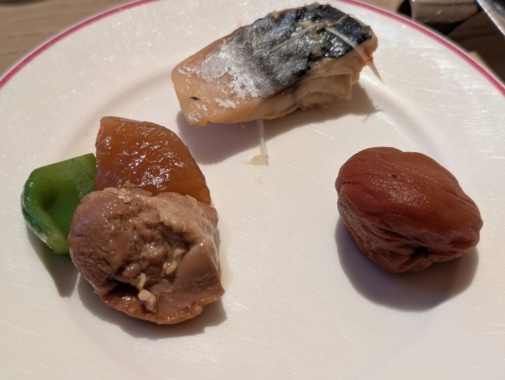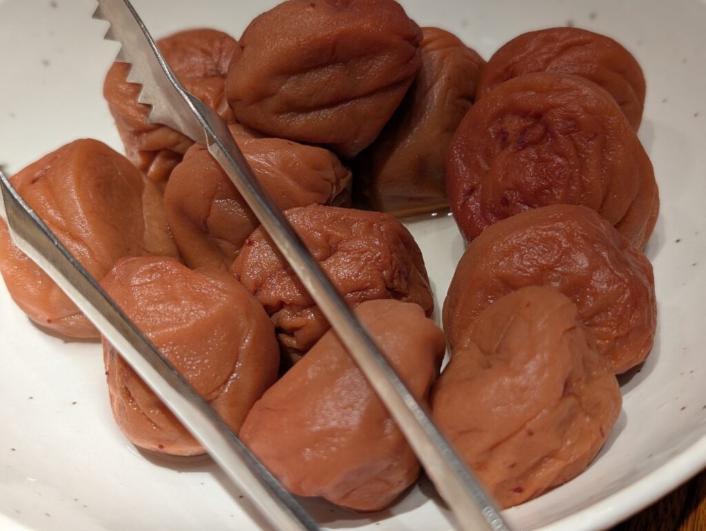 先ほど紹介した煮物、鯖の味噌煮の横に並んでいるの、これ梅干しなんです。