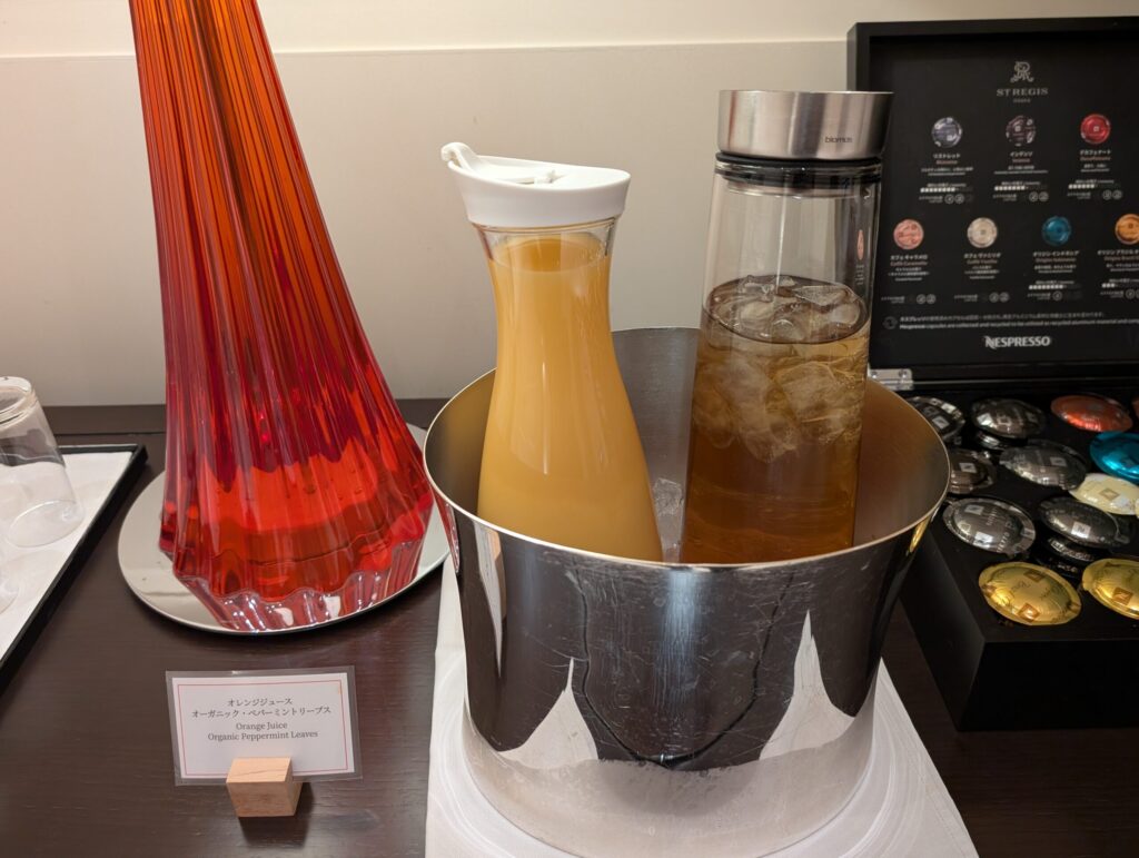 提供されていたのはオレンジジュースとオーガニック・ペパーミントリーブスで、いずれも朝を爽やかに迎えるのにぴったりです。