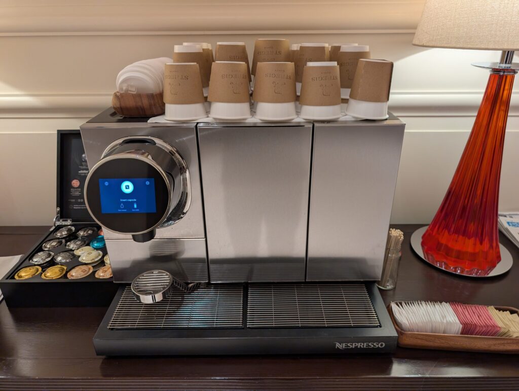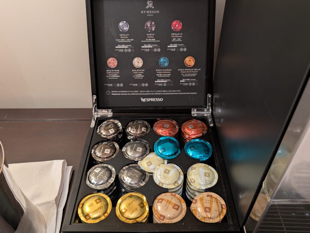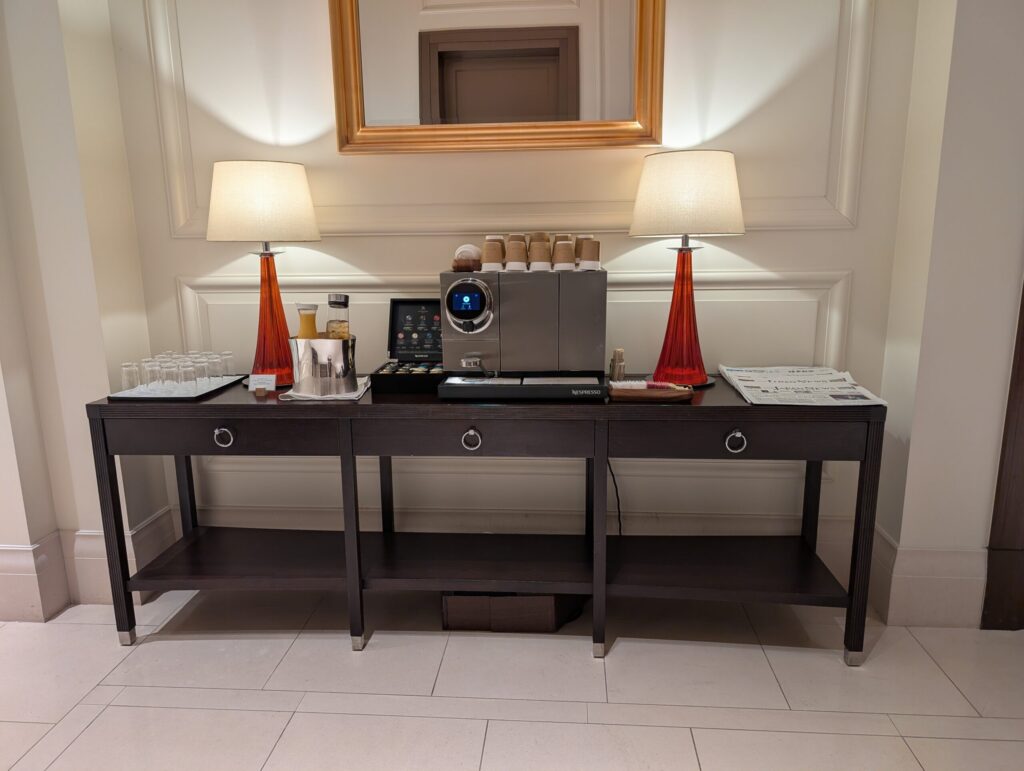 ウェイクアップドリンクと同じところにコーヒーマシンが置かれており、お部屋で楽しむドリンクをテイクアウトすることができます。