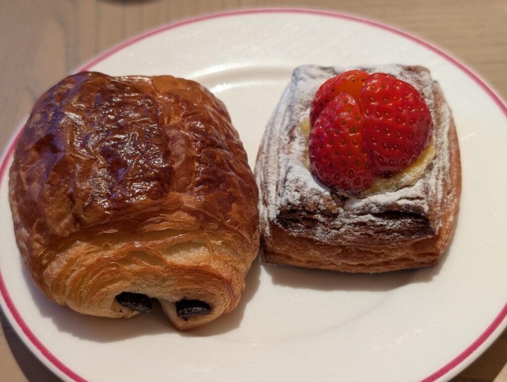 いちごデニッシュと同様に、サクサク生地の食感や香ばしさにチョコレートの甘さと香りがマッチしたパン・オ・ショコラ。