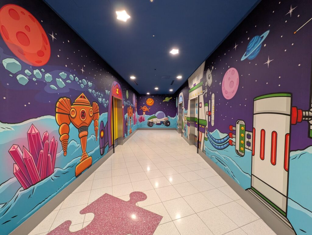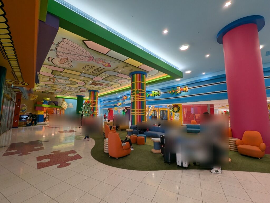 青空が描かれた室内h明るく開放感があり、実際に広々としていたので、楽しさはもちろん、快適さも感じられました。