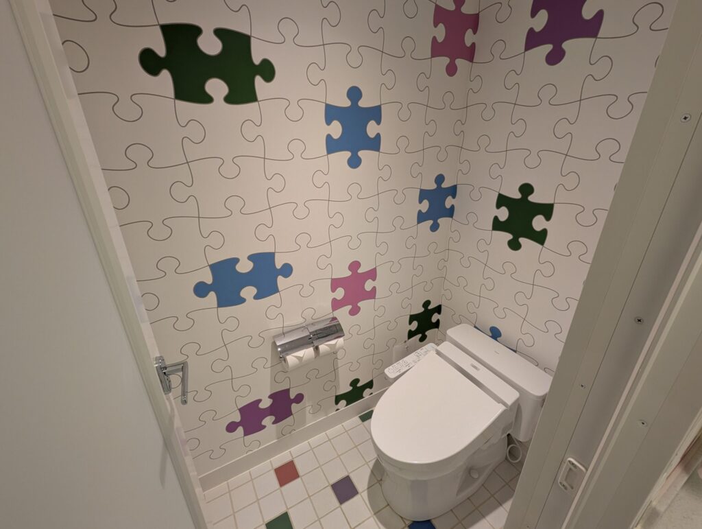 ジグゾーパズルの壁紙と鏡の泡模様がとてもかわいいですよね!