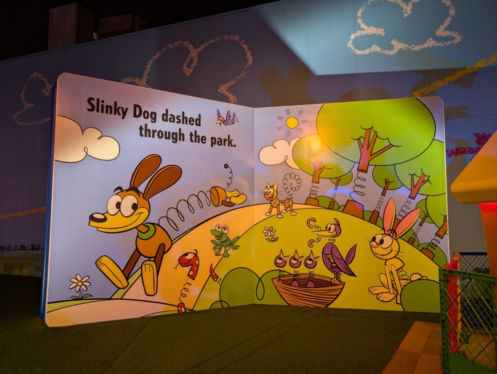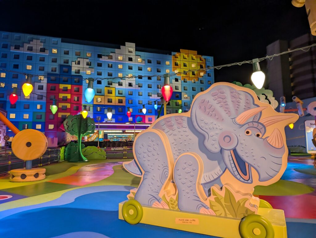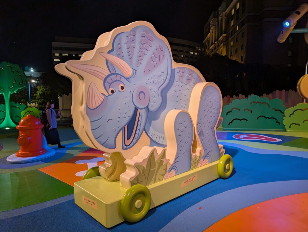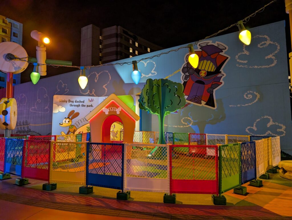 トイ・ストーリーホテルの敷地に入ってまず最初に迎えてくれるスリンキー・ドッグパークは様々なキャラクターやおもちゃが並んでいています。