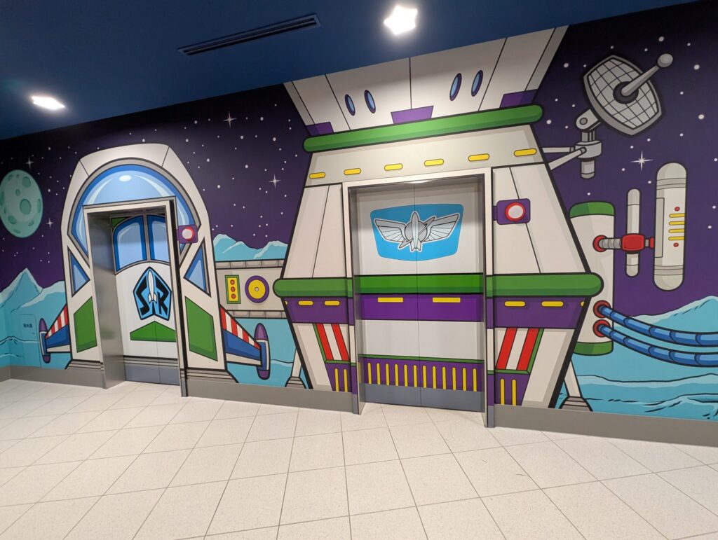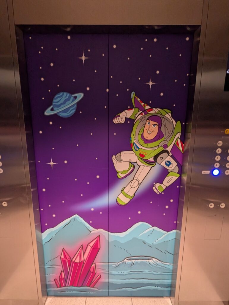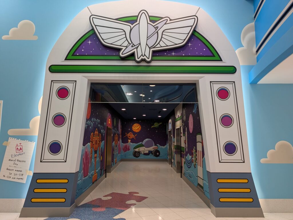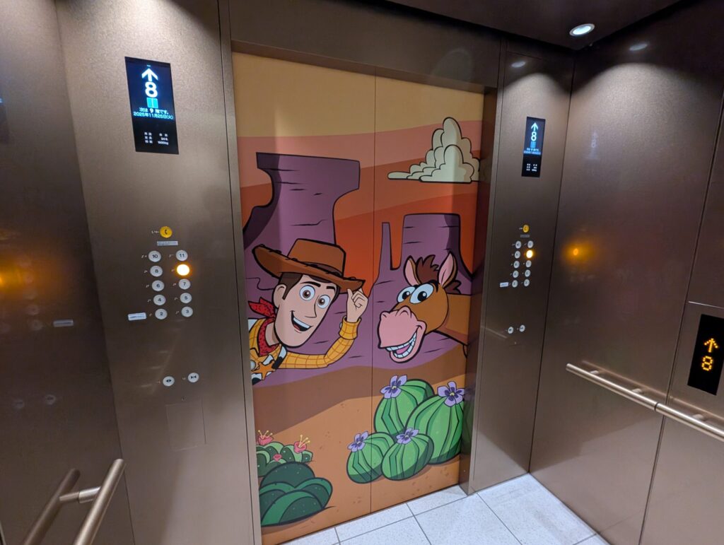 ロビーの両側に客室階に上がるためのエレベーターがあるのですが、片側はウッディ仕様、もう片側はバズ・ライトイヤー仕様となっています。