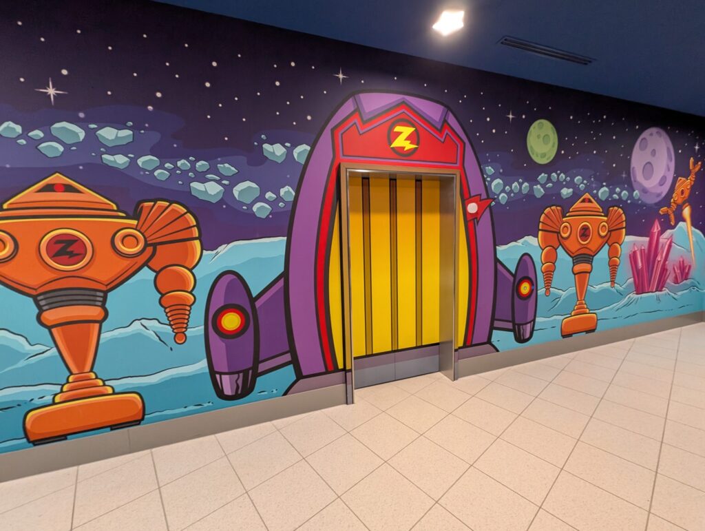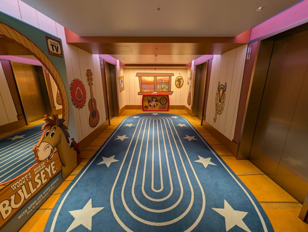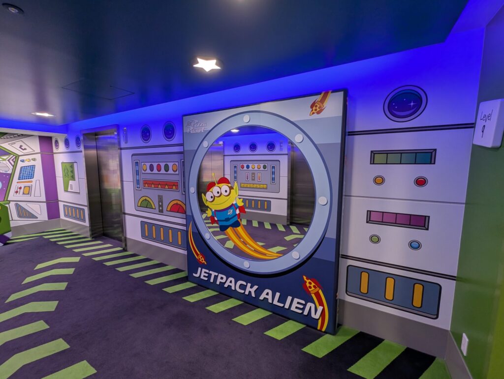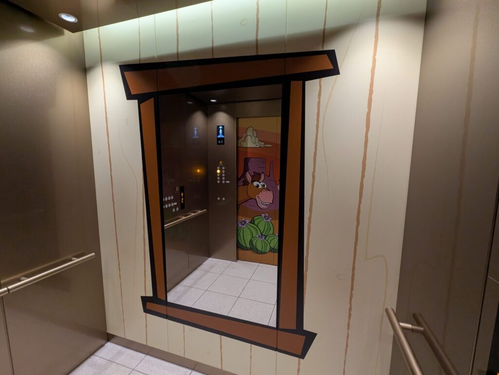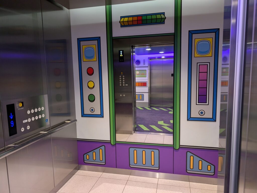 ロビーの両側に客室階に上がるためのエレベーターがあるのですが、片側はウッディ仕様、もう片側はバズ・ライトイヤー仕様となっています。