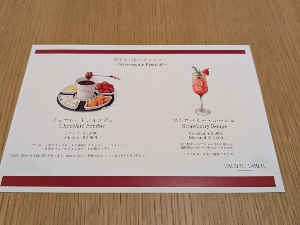 案内時にビュッフェについて軽く案内があり、チョコレートフォンデュや特別ドリンクの注文等を確認されます。私たちはビュッフェの料理に集中したかったので、今回は注文しませんでした。