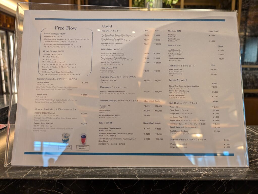アルコール類は別料金となっていて、フリーフロー(飲み放題)の料金設定もありました。